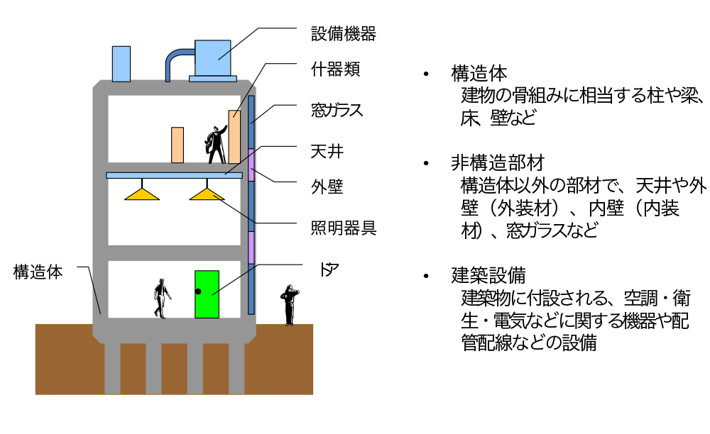 事業継続や使用性の観点から建物の耐震性を評価するためには、構造体に加えて設備や非構造部材についても対象とする必要があります。イー・アール・エスでは、構造体の耐震診断に加え、地震リスク評価につながる簡易動的解析や目視調査による診断など、建物全体・細部にわたる多彩なメニューを取り揃えています。